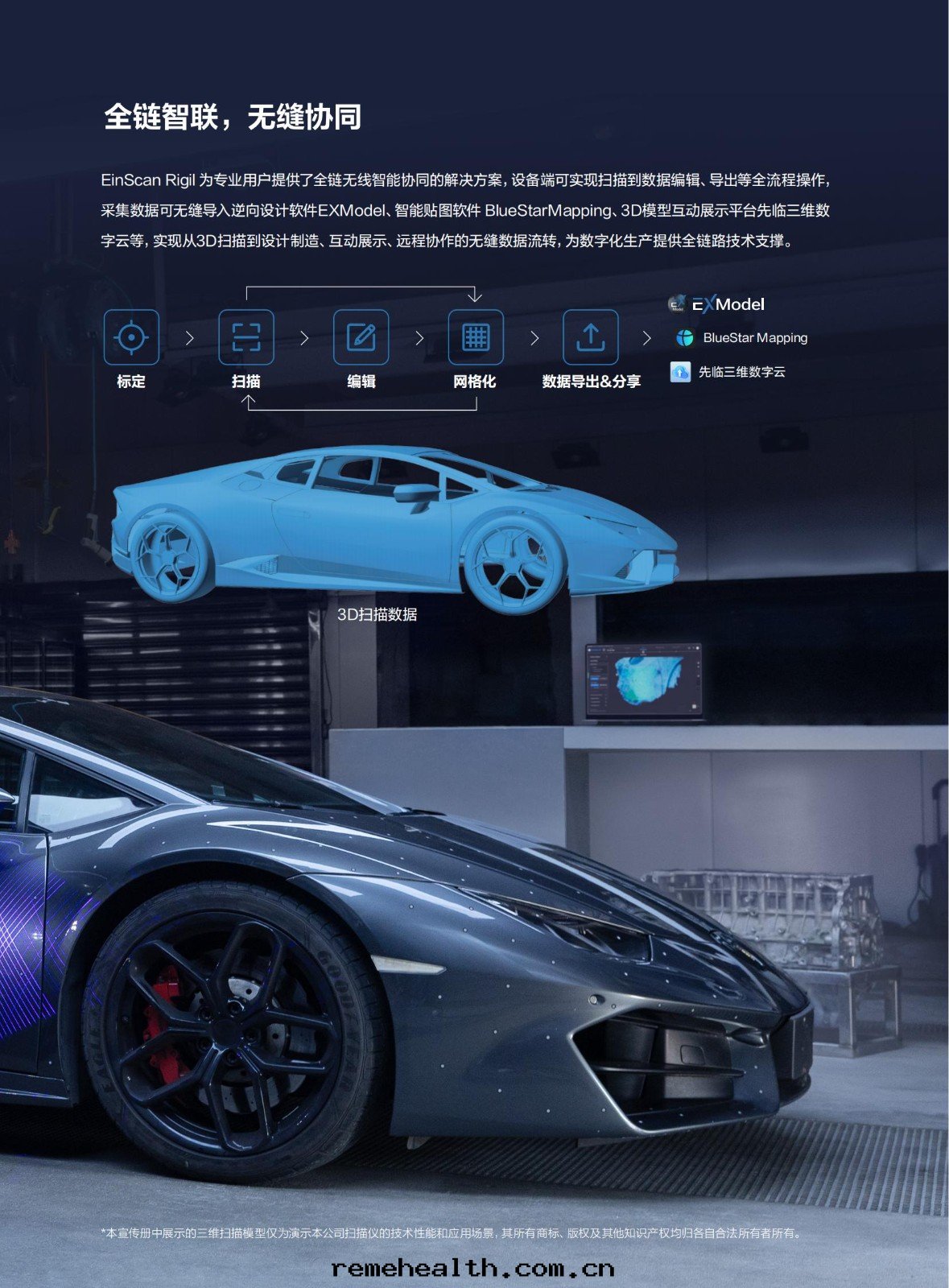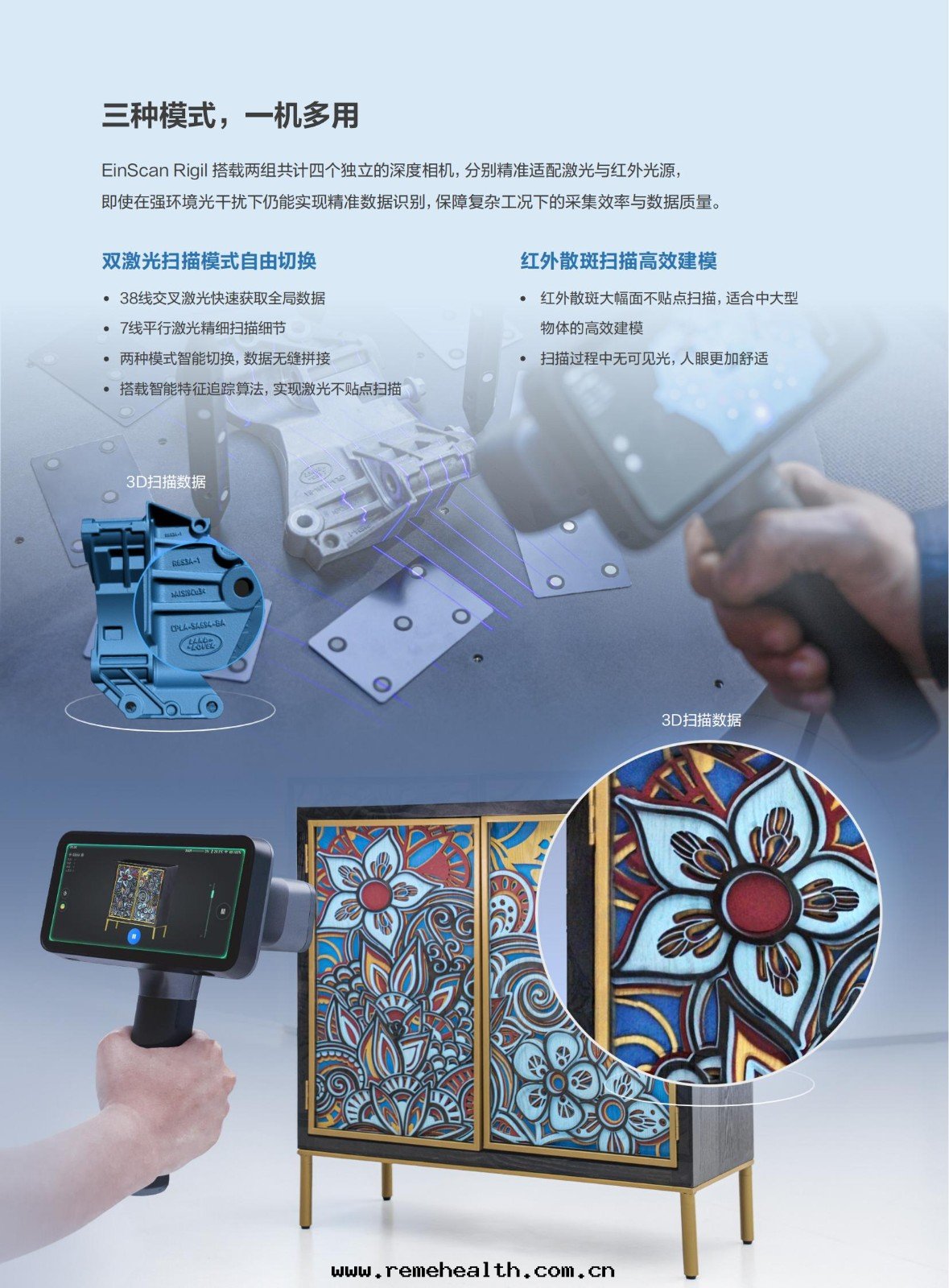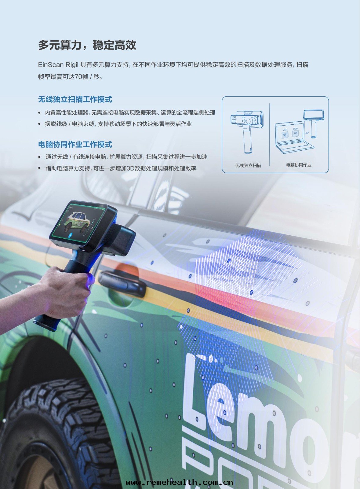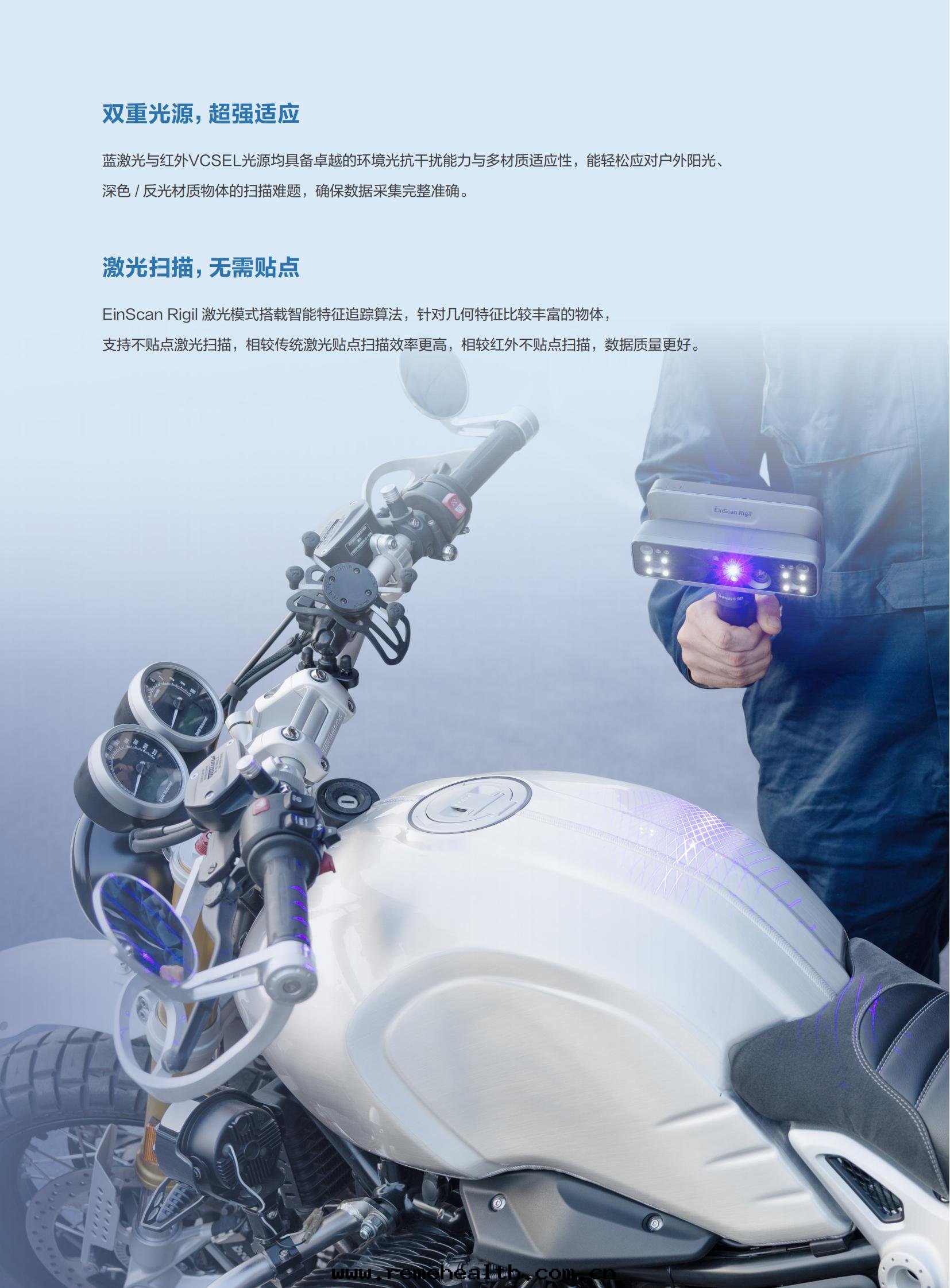 産品簡介:EinScan Rigil是(shì)先(xiān)臨在(zài)延續無線(xiàn)掃描三(sān)代(dài)技術(shù)優勢的(de)同(tóng)时(shí),創新(xīn)融合混合光(guāng)源技術(shù)與(yǔ)多(duō)模态算力驅動(dòng)體(tǐ)系(xì),大(dà)幅拓展(zhǎn)了(le)設備的(de)應(yìng)用(yòng)範圍。相較前(qián)代(dài)産品,其(qí)靈活的(de)算力配置模式,既可(kě)支持(chí)設備端無線(xiàn)独立掃描,也(yě)可(kě)通(tòng)过(guò)無線(xiàn)/有(yǒu)線(xiàn)連(lián)接PC獲取更(gèng)強(qiáng)算力,确保在(zài)不(bù)同(tóng)作(zuò)業环(huán)境下(xià)都能(néng)穩定(dìng)高(gāo)效地完成(chéng)掃描與(yǔ)數據(jù)運算。