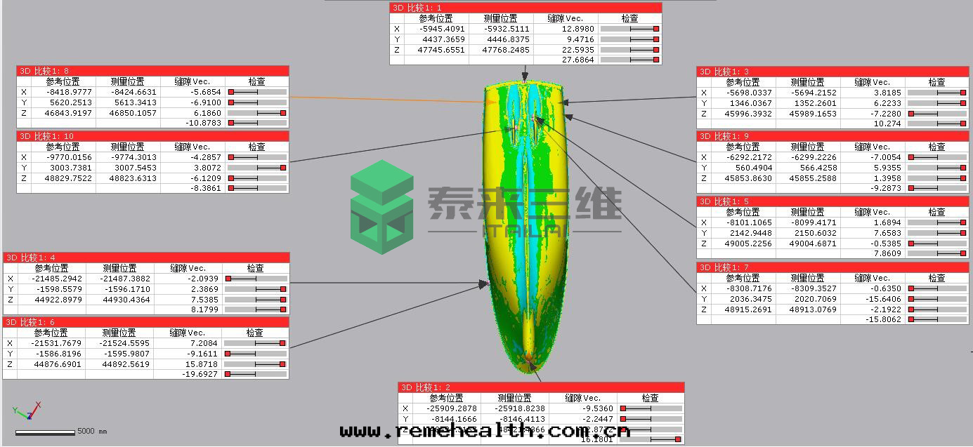 4、对(duì)比檢測:分(fēn)别将設計(jì)模型和(hé)三(sān)角(jiǎo)面(miàn)片(piàn)模型导入(rù)到(dào)Geomagic Control X中(zhōng)進(jìn)行二(èr)維、三(sān)維檢測,标(biāo)記(jì)出(chū)現(xiàn)有(yǒu)模具與(yǔ)設計(jì)模型的(de)誤差,並(bìng)生(shēng)成(chéng)檢測報告。