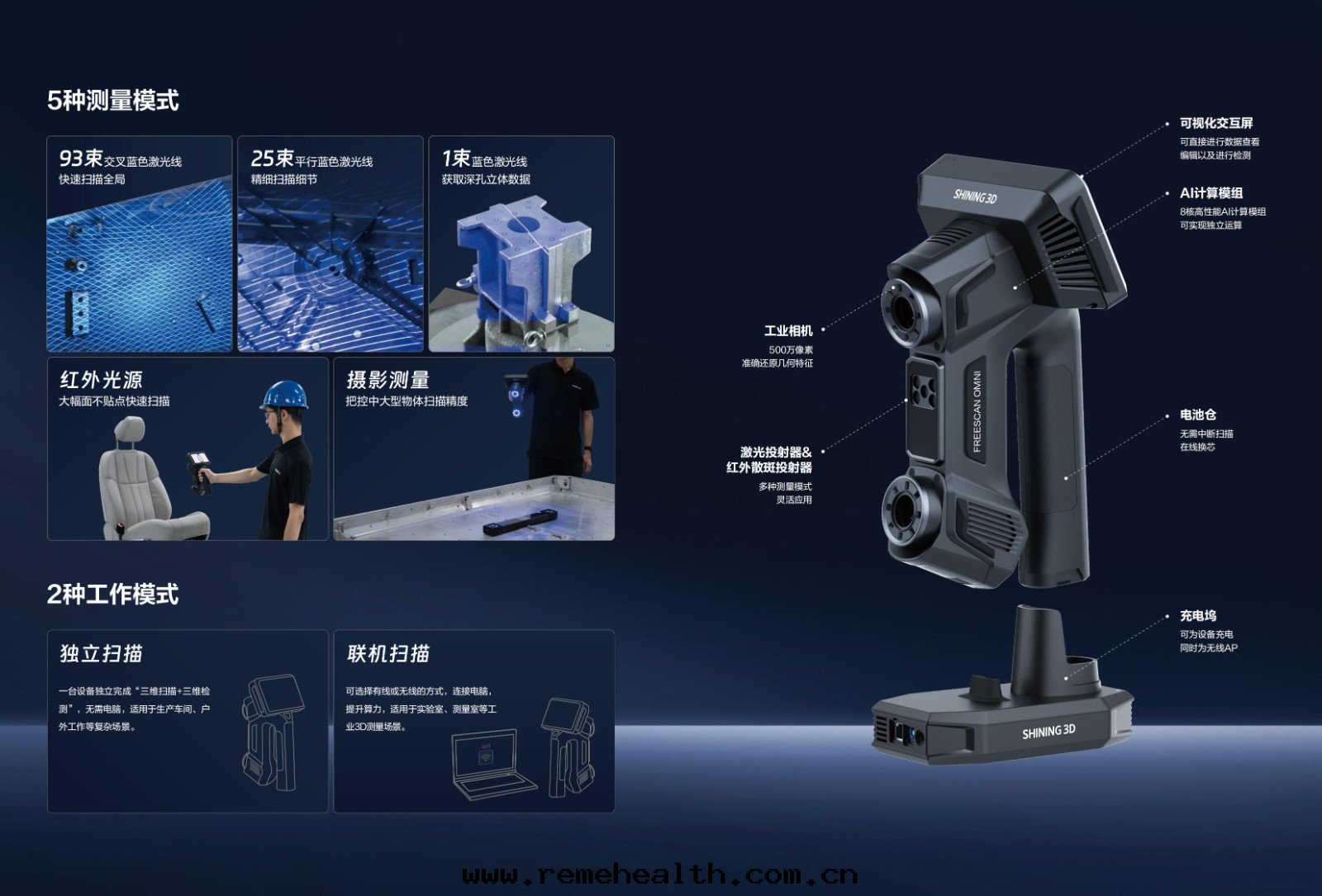 産品簡介:FreeScan Omni無線(xiàn)一(yī)體(tǐ)式手(shǒu)持(chí)三(sān)維掃描測量儀是(shì)先(xiān)臨三(sān)維自(zì)主(zhǔ)創新(xīn)開(kāi)发的(de)一(yī)款具有(yǒu)劃(huà)时(shí)代(dài)意(yì)義的(de)産品,其(qí)采用(yòng)第(dì)三(sān)代(dài)無線(xiàn)掃描技術(shù),無需電(diàn)腦,搭载(zài)算法(fǎ)通(tòng)过(guò)德國(guó)PTB双(shuāng)重(zhòng)精度(dù)認證的(de)自(zì)研工業計(jì)量三(sān)維檢測模块(kuài),可(kě)實(shí)現(xiàn)一(yī)台(tái)設備独立完成(chéng)“三(sān)維掃描+三(sān)維檢測”(無需連(lián)接電(diàn)腦以(yǐ)及(jí)電(diàn)源線(xiàn))。